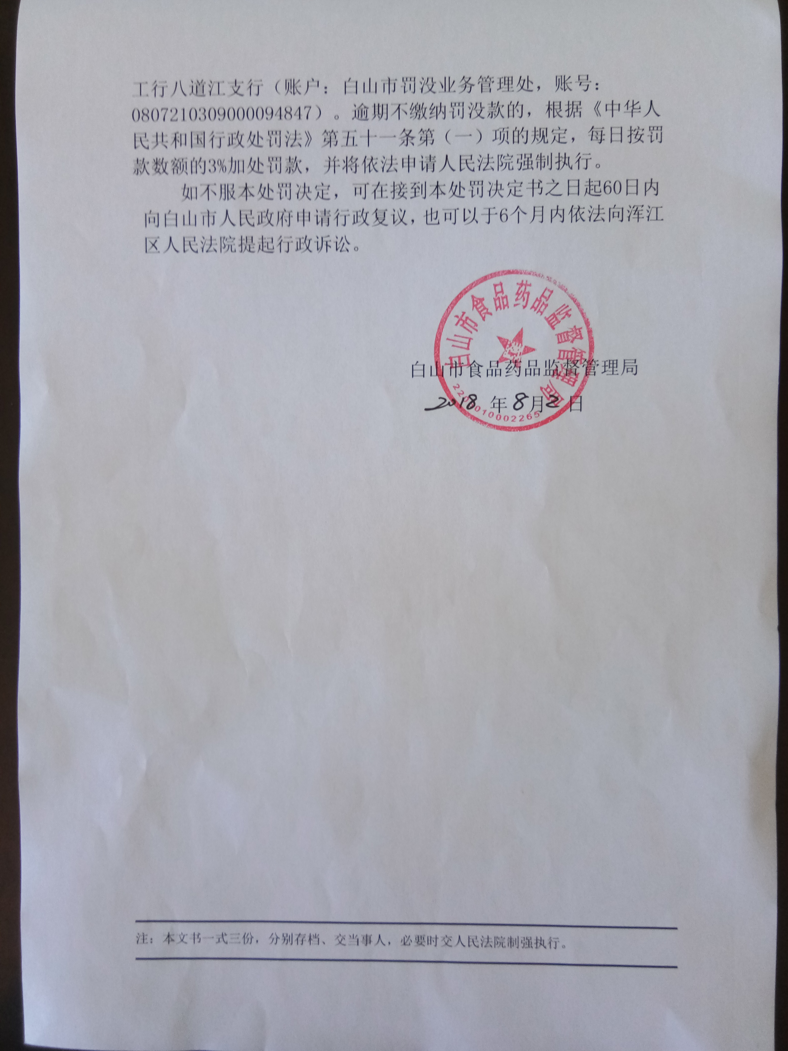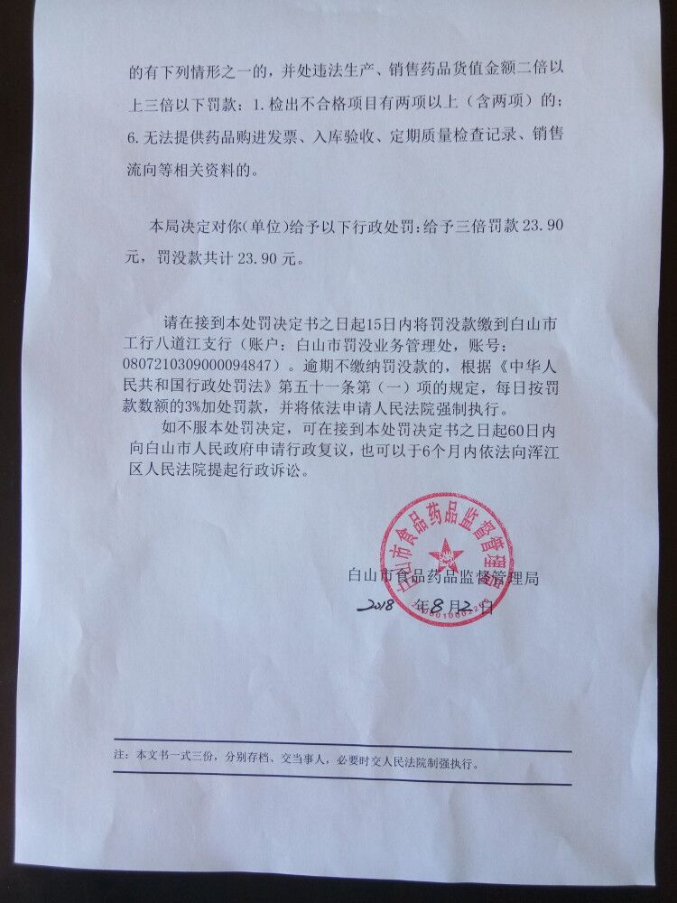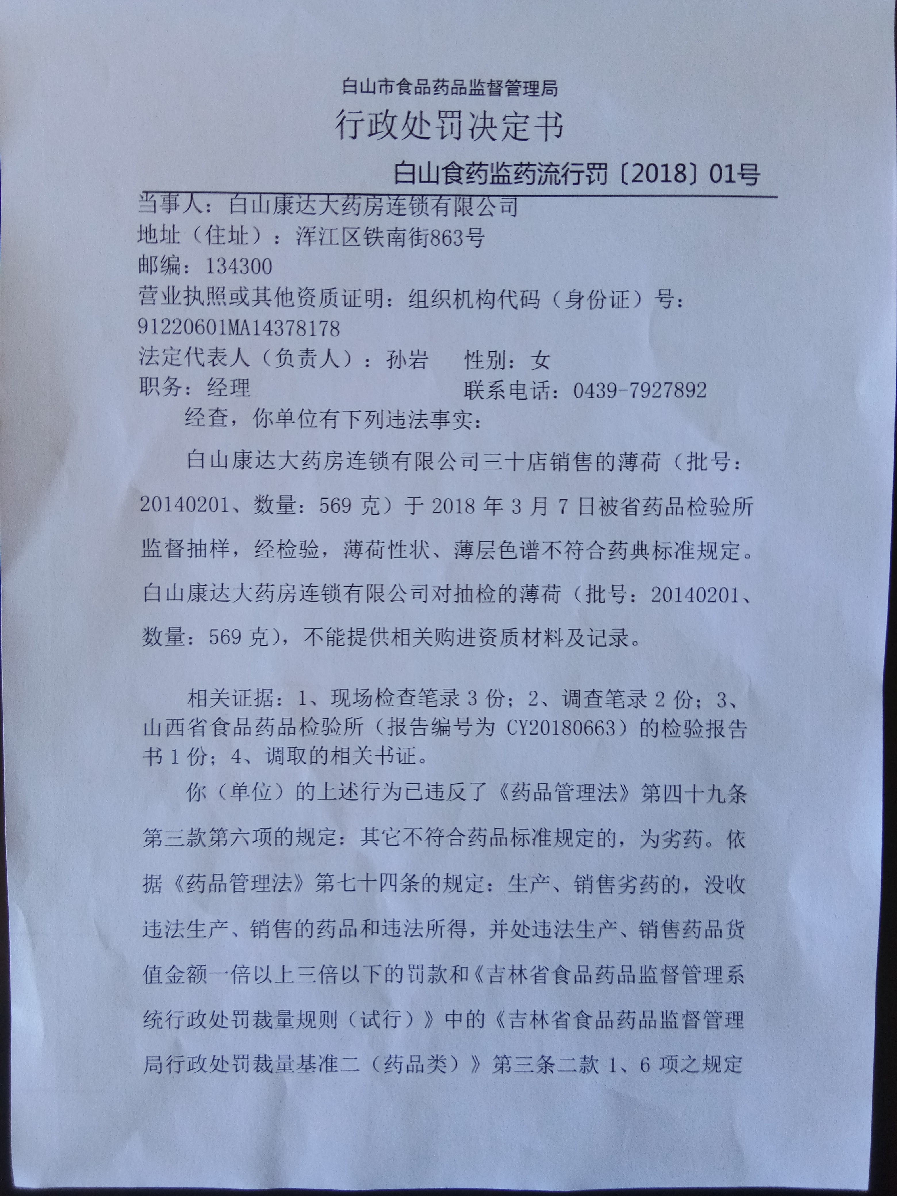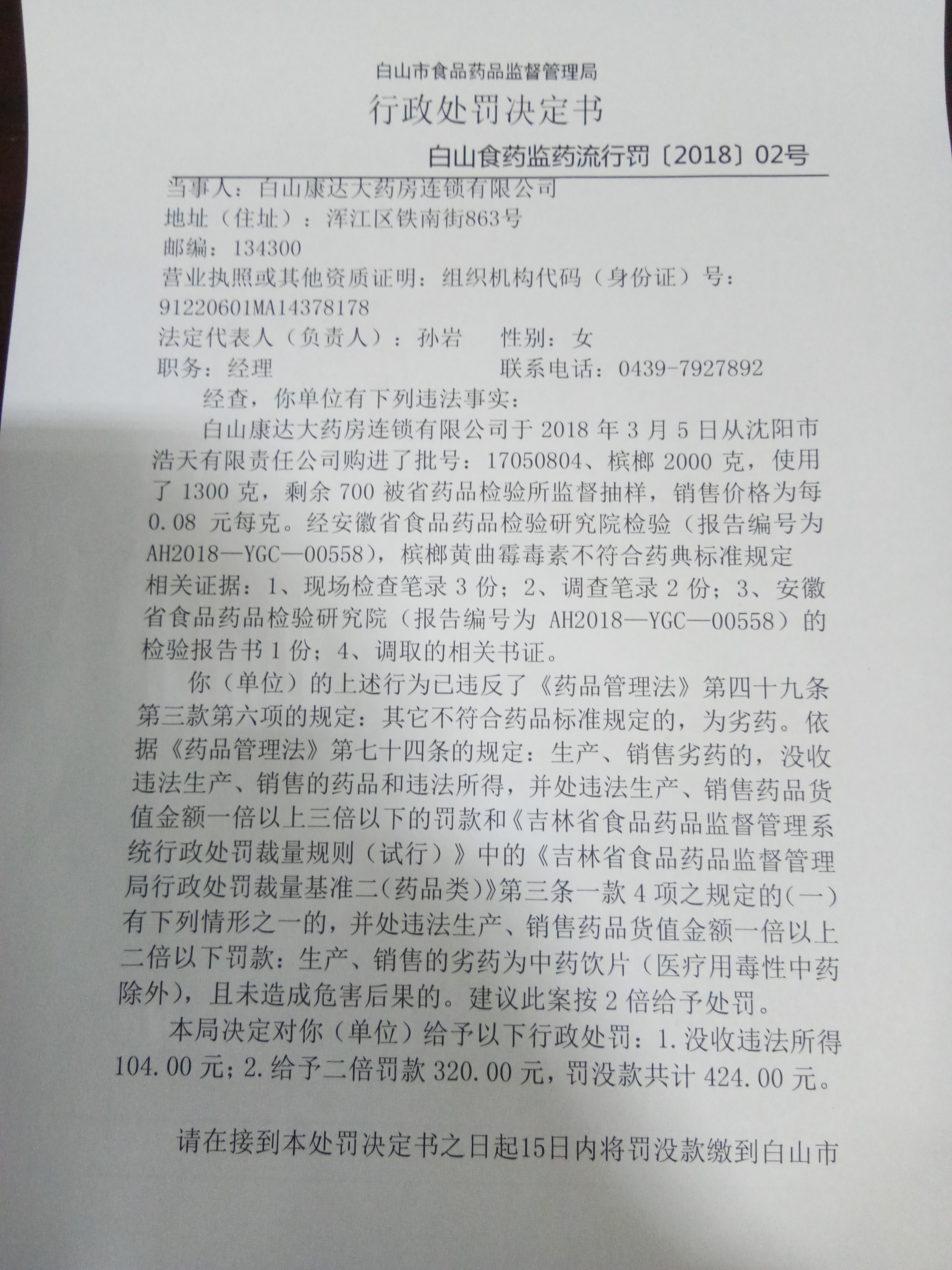 | 白山食药监药流行罚〔2018〕02号 | 白山康达大药房连锁有限公司销售劣药槟榔案 | 罚款 | 销售劣药槟榔 | 药品管理法第四十九条三款六项 | 白山康达大药房连锁有限公司 | 91220601MA14378178 | 孙岩 | 1.没收违法所得104.00元;2.给予二倍罚款320.00元,罚没款共计424.00元。 | 2018\08\02 | 白山市食品药品监督管理局 |