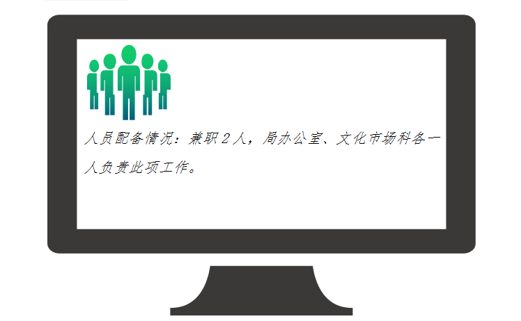 2、人员配备情况。兼职2人,局办公室、文化市场科各一人负责此项工作。