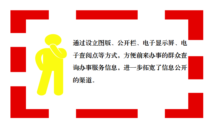 3、畅通公开渠道。通过设立图版、公开栏、电子显示屏、电子查阅点等方式,方便前来办事的群众查询办事服务信息,进一步拓宽了信息公开的渠道。