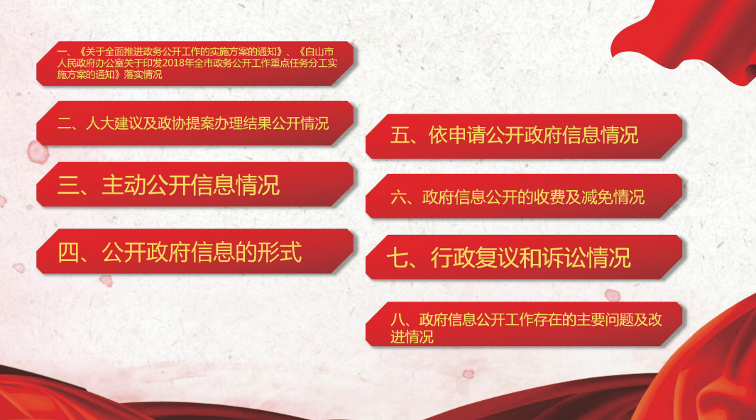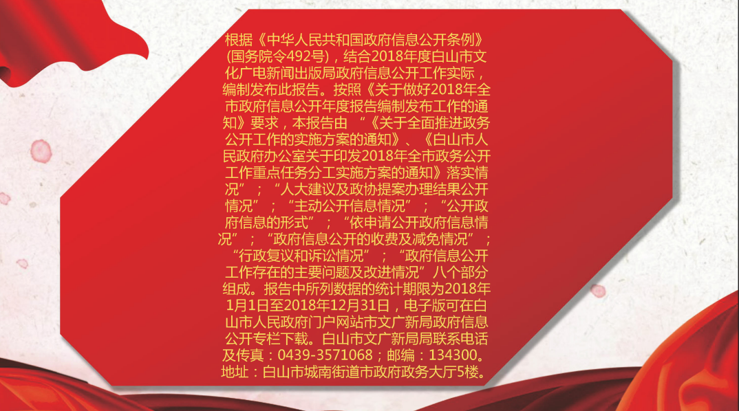 根据《中华人民共和国政府信息公开条例》(国务院令492号),结合2018年度白山市文化广电新闻出版局政府信息公开工作实际,编制发布此报告。按照《关于做好2018年全市政府信息公开年度报告编制发布工作的通知》要求,本报告由 “《关于全面推进政务公开工作的实施方案的通知》、《白山市人民政府办公室关于印发2018年全市政务公开工作重点任务分工实施方案的通知》落实情况”;“人大建议及政协提案办理结果公开情况”;“主动公开信息情况”;“公开政府信息的形式”;“依申请公开政府信息情况”;“政府信息公开的收费及减免情况”;“行政复议和诉讼情况”;“政府信息公开工作存在的主要问题及改进情况”八个部分组成。报告中所列数据的统计期限为2018年1月1日至2018年12月31日,电子版可在白山市人民政府门户网站市文广新局政府信息公开专栏下载。白山市文广新局局联系电话及传真:0439-3571068;邮编:134300。地址:白山市城南街道市政府政务大厅5楼。