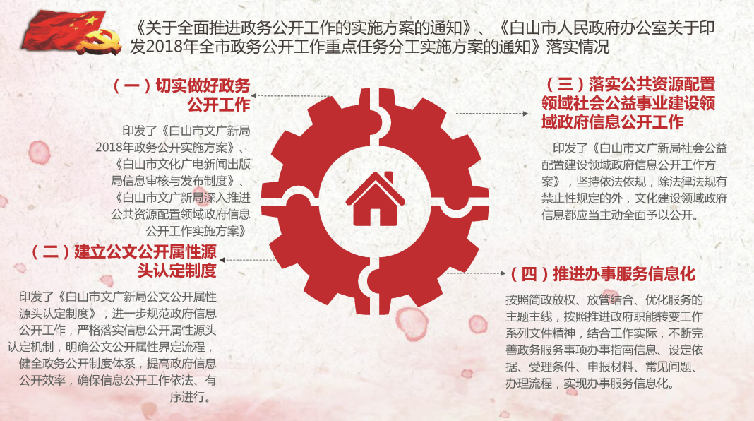 印发了《白山市文广新局2018年政务公开实施方案》、《白山市文化广电新闻出版局信息审核与发布制度》、《白山市文广新局深入推进公共资源配置领域政府信息公开工作实施方案》等,保障公民、法人和其他组织在文化、广电、新闻出版领域的知情权、参与权和监督权,提高文化工作的透明度,促进依法行政,充分发挥环境对人民群众生产、生活和经济社会活动的服务作用。