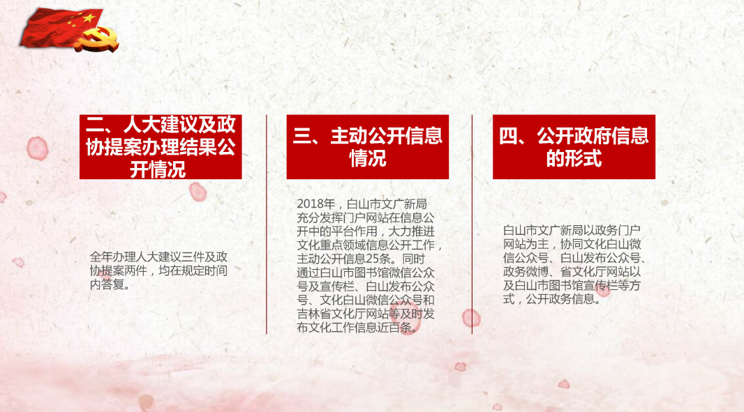 白山市文广新局以政务门户网站为主,协同文化白山微信公众号、白山发布公众号、政务微博、省文化厅网站以及白山市图书馆宣传栏等方式,公开政务信息。